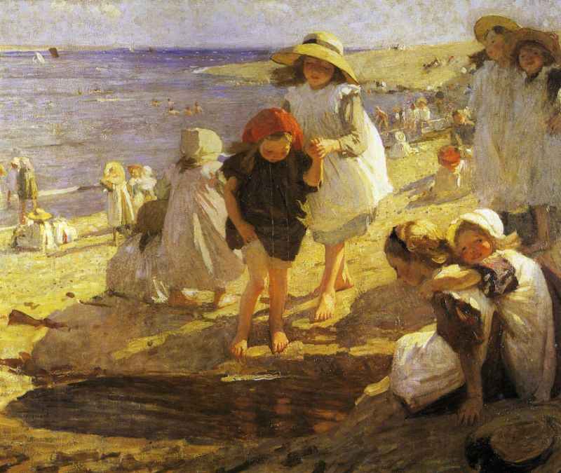 Quando vi a pintura de Forbes, fez-me lembrar a de Aurélia de Sousa. Creio que a principal semelhança (além do tema) está na figura vestida de branco em primeiro plano, ladeada por árvores. Contudo, a pintura portuguesa tem uma leitura mais complexa, o que a torna mais moderna.